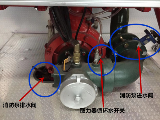 關(guān)閉消防泵進(jìn)水閥,打開消防泵排水閥,關(guān)閉取力器循環(huán)水開關(guān)