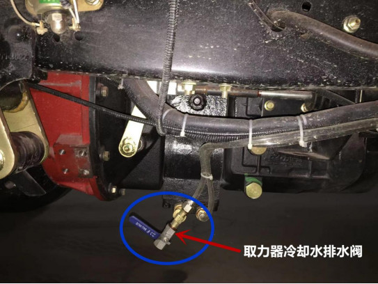 打開取力器冷卻水排水閥,該閥門在駕駛室下方。