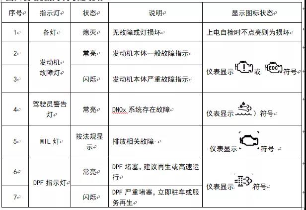 國(guó)六發(fā)動(dòng)機(jī)指示燈狀態(tài)說(shuō)明: