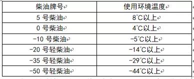 為了使發(fā)動(dòng)機(jī)擁有更高的可靠性和更好的經(jīng)濟(jì)型,柴油應(yīng)選用符合19147-2018國(guó)六標(biāo)準(zhǔn)的正規(guī)柴油,并隨著地區(qū)環(huán)境氣溫的不同而選用不同牌號(hào)的清潔柴油。根據(jù)使用環(huán)境氣溫,按下表選用不同牌號(hào)的清潔柴油: